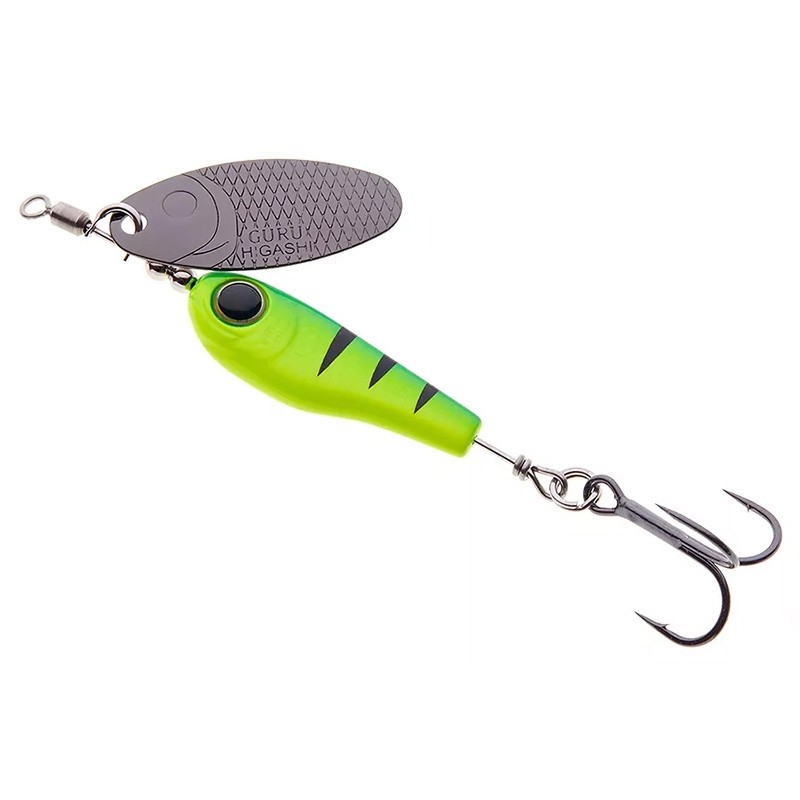 Блесна HIGASHI GURU. Сердечник блесны выполнен в виде реалистичного тела рыбки, но с увеличенными по размеру глазами- они являются отличным раздражительным фактором, провоцирующим хищника на немедленную атаку. Плоский профиль в виде тела рыбки не только более заметный, создает специфические блики, но и имеет и свою собственную игру. Для оптимизации работы блесны на течении - в ось блесны интегрирован вертлюжок с колечком. Блесна окрашены флуоресцентными красками (светятся в UV лучах). Блесна специально разрабатывалась для ловли на течении, но она также заведется и при ловли в стоячей воде, как для охоты за лососевыми видами рыб, форели, гольца, ленка и т.д., так и для ловли таких хищников средней полосы как голавль, жерех, окунь и т.д. Длина приманки 37мм Размер лепестка 30мм*15мм