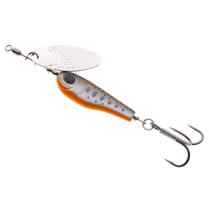 Блесна HIGASHI GURU. Сердечник блесны выполнен в виде реалистичного тела рыбки, но с увеличенными по размеру глазами- они являются отличным раздражительным фактором, провоцирующим хищника на немедленную атаку. Плоский профиль в виде тела рыбки не только более заметный, создает специфические блики, но и имеет и свою собственную игру. Для оптимизации работы блесны на течении - в ось блесны интегрирован вертлюжок с колечком. Блесна окрашены флуоресцентными красками (светятся в UV лучах). Блесна специально разрабатывалась для ловли на течении, но она также заведется и при ловли в стоячей воде, как для охоты за лососевыми видами рыб, форели, гольца, ленка и т.д., так и для ловли таких хищников средней полосы как голавль, жерех, окунь и т.д. Длина приманки 28мм Размер лепестка 25мм*13мм