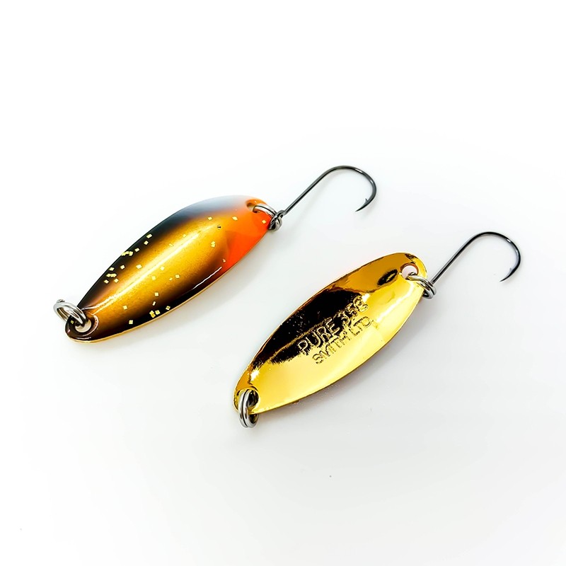 Колеблющаяся блесна Pure от японской фирмы SMITH – это традиционная лососевая приманка, исполненная в лучших японских традициях высокого качества и современных технологий. Pure - означает «Чистый». Pure выполнена из твердых металлов, с позолотой и серебром с цветными вкраплениями. Блесна изменяет свой цвет в зависимости от воды и температуры воздуха. Конструктивные особенности приманки, позволяют использовать блесну, как на слабо текущей воде, так и на бурных перекатах горных рек. Тонкое широкое тело блесны, закругляется глубокой «ложкой», что позволяет работать приманкой даже на мелководье в двадцать-тридцать сантиметров. Все дело в технике проводки и строе используемого спиннинга. При спокойной проводке, на слабо текущей воде, блесну, особенно на свалах, можно чуть притормозить. Тогда блесна, элегантно планирую в горизонтах, будет светиться боками, изображая неразумного малька, легкой доступностью соблазняя окуня или щуку. Деликатная подтяжка, и снова пауза или ступенька. Иногда окунь «заводится» при сня-тии приманки с зацепа. Зацепилась колебалка за ракушку, дернули удилищем – и окунь кинулся к освободившейся приманке. При медленной равномерной проводке, любопытный окунь просто сопровождает блесну. Стоит немного убыстрить темп, немного подыгрывая кончиком спиннинга, сразу следует удар полосатика. «Мудрить» с проводками можно до бесконечности. При проводке по кувшинкам, широкие бока блесны защитят крючки от зацепов. Короткими забросами под берег, чуть потряхивая кончиком спиннинга, можно заставить «танцевать» блесну на одном месте, имитируя упавшее насекомое и достать голавля. Дальнобойность тяжелых Pure и множество вариаций проводки по «котлу», достанет осторожного жереха. В начале сезона поймать жереха, не представляется сложной задачей. А в середине сезона, в июле, микроколебалка Pure, одна из немногих приманок, на которые среагирует этот осторожный хищник. Не просто ожидание всплеска, а забросы поперек течения, с проводкой на снос - «малек», которого сносит течение. При ловле легкими снастями, даже жерех на килограмм – очень достойный соперник, способный подарить немало приятных переживаний. На маленькие «Пюрешки» достаточно часто клюет, например, плотва и другая бель. Точным забросом к водяной растительности, на медленной проводке Pure принесет красноперку и даже подъязка. Миниатюрные колеблющиеся блесны Pure, изначально создавались для ловли форели. Если написать Pure в любом поисковике - найдете кучу восторженных отзывов. Опыт наших рыболовов говорит о том, что именно микроколебалки приносят успех в достаточно сложных условиях ловли прудовой радужки. На Кольском, самая популярная блесна Pure 13,0. Семга на сильном течении, тундровая рыбалка на гольца и кумжу, где они по достоинству оценили разнообразную игру, расцветки и одинарный крючок на заросших участках. Даже Пюрешки 6,5 грамм отлично отработают на крупной кумже. Проводка ступенькой, короткие подмотки, с такими же короткими стопами. Поклевки на паузах в начале движения приманки. Голец атакует блесну на максимально медленной проводке, или подбирает приманку при касании с грунтом. На Pure ловятся практически все камчатские лососи и еще бычки, навага и корюшка из подо льда. Проводки любые в зависимости от условий водоема (течение, глубина) и фантазии рыболова. В Приморье, н