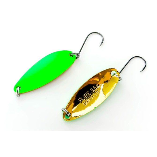 Колеблющаяся блесна Pure от японской фирмы SMITH – это традиционная лососевая приманка, исполненная в лучших японских традициях высокого качества и современных технологий. Pure - означает «Чистый». Pure выполнена из твердых металлов, с позолотой и серебром с цветными вкраплениями. Блесна изменяет свой цвет в зависимости от воды и температуры воздуха. Конструктивные особенности приманки, позволяют использовать блесну, как на слабо текущей воде, так и на бурных перекатах горных рек. Тонкое широкое тело блесны, закругляется глубокой «ложкой», что позволяет работать приманкой даже на мелководье в двадцать-тридцать сантиметров. Все дело в технике проводки и строе используемого спиннинга. При спокойной проводке, на слабо текущей воде, блесну, особенно на свалах, можно чуть притормозить. Тогда блесна, элегантно планирую в горизонтах, будет светиться боками, изображая неразумного малька, легкой доступностью соблазняя окуня или щуку. Деликатная подтяжка, и снова пауза или ступенька. Иногда окунь «заводится» при сня-тии приманки с зацепа. Зацепилась колебалка за ракушку, дернули удилищем – и окунь кинулся к освободившейся приманке. При медленной равномерной проводке, любопытный окунь просто сопровождает блесну. Стоит немного убыстрить темп, немного подыгрывая кончиком спиннинга, сразу следует удар полосатика. «Мудрить» с проводками можно до бесконечности. При проводке по кувшинкам, широкие бока блесны защитят крючки от зацепов. Короткими забросами под берег, чуть потряхивая кончиком спиннинга, можно заставить «танцевать» блесну на одном месте, имитируя упавшее насекомое и достать голавля. Дальнобойность тяжелых Pure и множество вариаций проводки по «котлу», достанет осторожного жереха. В начале сезона поймать жереха, не представляется сложной задачей. А в середине сезона, в июле, микроколебалка Pure, одна из немногих приманок, на которые среагирует этот осторожный хищник. Не просто ожидание всплеска, а забросы поперек течения, с проводкой на снос - «малек», которого сносит течение. При ловле легкими снастями, даже жерех на килограмм – очень достойный соперник, способный подарить немало приятных переживаний. На маленькие «Пюрешки» достаточно часто клюет, например, плотва и другая бель. Точным забросом к водяной растительности, на медленной проводке Pure принесет красноперку и даже подъязка. Миниатюрные колеблющиеся блесны Pure, изначально создавались для ловли форели. Если написать Pure в любом поисковике - найдете кучу восторженных отзывов. Опыт наших рыболовов говорит о том, что именно микроколебалки приносят успех в достаточно сложных условиях ловли прудовой радужки. На Кольском, самая популярная блесна Pure 13,0. Семга на сильном течении, тундровая рыбалка на гольца и кумжу, где они по достоинству оценили разнообразную игру, расцветки и одинарный крючок на заросших участках. Даже Пюрешки 6,5 грамм отлично отработают на крупной кумже. Проводка ступенькой, короткие подмотки, с такими же короткими стопами. Поклевки на паузах в начале движения приманки. Голец атакует блесну на максимально медленной проводке, или подбирает приманку при касании с грунтом. На Pure ловятся практически все камчатские лососи и еще бычки, навага и корюшка из подо льда. Проводки любые в зависимости от условий водоема (течение, глубина) и фантазии рыболова. В Приморье, н