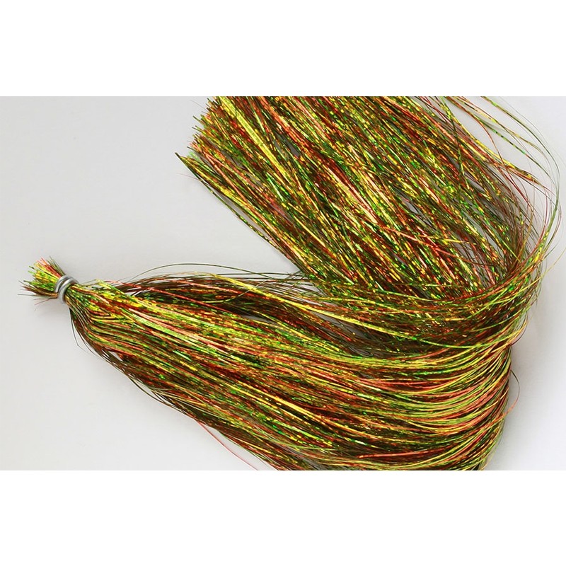 Оригинальный Flashabou, шириной 1/69 ”с трехмерным цветовым эффектом, волокна сложены пополам, для изготовления больших моделей мух. Длина 53 см. Примерно 800 нитей в упаковке.