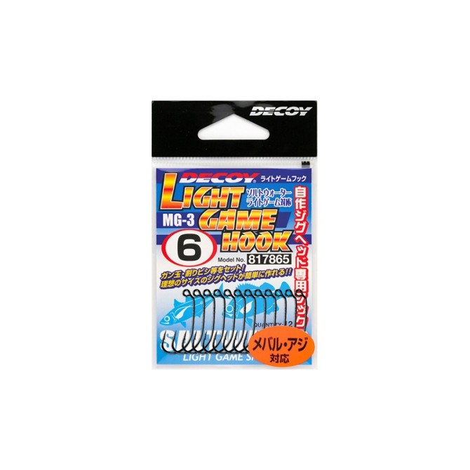 DECOY MG-3 LIGHT GAME — серия одинарных крючков. Данные крючки могут применяться как для оснастки шарнирных грузов, так и для самостоятельного изготовления джиг-головок. Их отличительной особенностью является изогнутое ближе к ушку крючка цевье. Ушко крючка имеет большой, удобный для монтажа размер. Крючки имеют специальное антикоррозийное покрытие и подходят для использования как в пресной, так и в соленой воде.