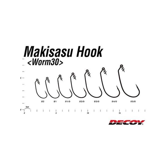 Decoy Worm 30 - офсетные крючки, у которых вместо привычной "ступеньки" для фиксации мягких приманок на крючках есть специальное приспособление, представляющее собой короткую спиральку с направляющим стержнем (Centering Pin Spring CPS). Эта спиралька свободно закреплена в кольце на конце цевья и более надежно удерживает приманку. Крючки Worm 30 Makisasu имеют достаточно широкий поддев и короткое цевье, отогнутое внутрь. Идеально подходят для техасской, каролинской оснасток.