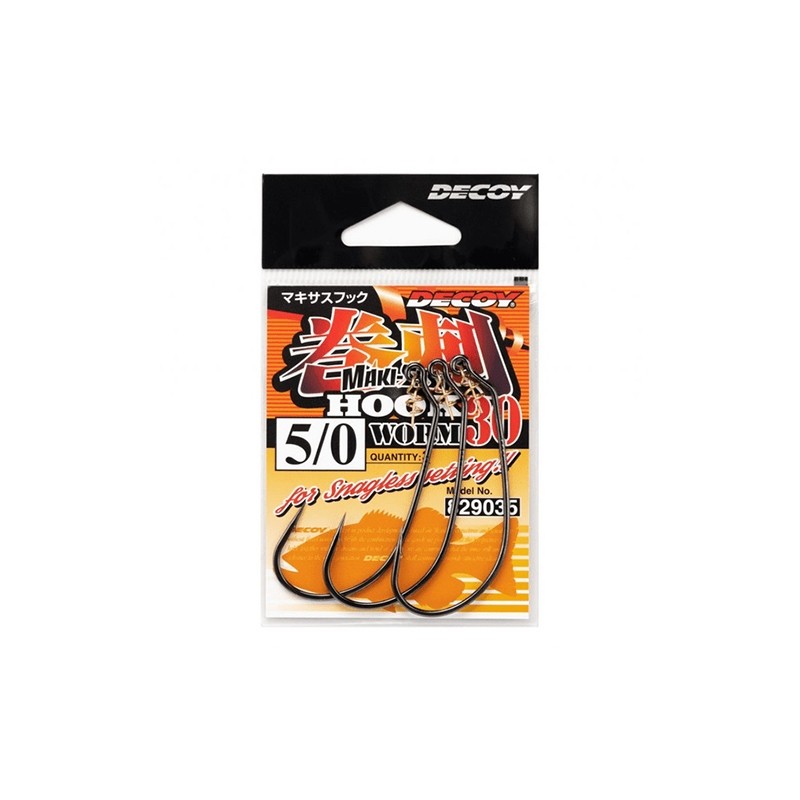 Decoy Worm 30 - офсетные крючки, у которых вместо привычной "ступеньки" для фиксации мягких приманок на крючках есть специальное приспособление, представляющее собой короткую спиральку с направляющим стержнем (Centering Pin Spring CPS). Эта спиралька свободно закреплена в кольце на конце цевья и более надежно удерживает приманку. Крючки Worm 30 Makisasu имеют достаточно широкий поддев и короткое цевье, отогнутое внутрь. Идеально подходят для техасской, каролинской оснасток.