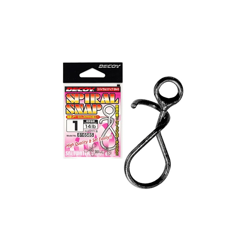 Decoy Sn-5 Spiral Snap – карабин спиральной формы с лабиринтным или винтовым принципом работы, который позволяет очень быстро и просто произвести замену приманки во время рыбалки. Заменить приманку крайне легко: необходимо поддеть носовую петлю или заводное ушко приманки загибом застёжки и произвести движение на себя, после чего можно выполнять заброс. Это гораздо быстрее, чем работа с открывающимися карабинами. Особенно Sn-5 Spiral Snap оценят любители зимней рыбалки, ведь голые руки будут гораздо меньше находиться на морозе. Петля для лески в данной модели пропаяна и не имеет острых частей, которые со временем могут повредить шнур. Благодаря компактному размеру и низкому сопротивлению в воде, а также широкому загибу, который не ограничивает движения оснастки, данный карабин можно использовать с приманками любого типа. Размер №0 с тестом 10lb отлично подойдёт для маленьких блесен и других микро приманок, а размеры №1-2 с соответствующим тестом 14 и 18lb для малых и средних воблеров и блесен большего размера.